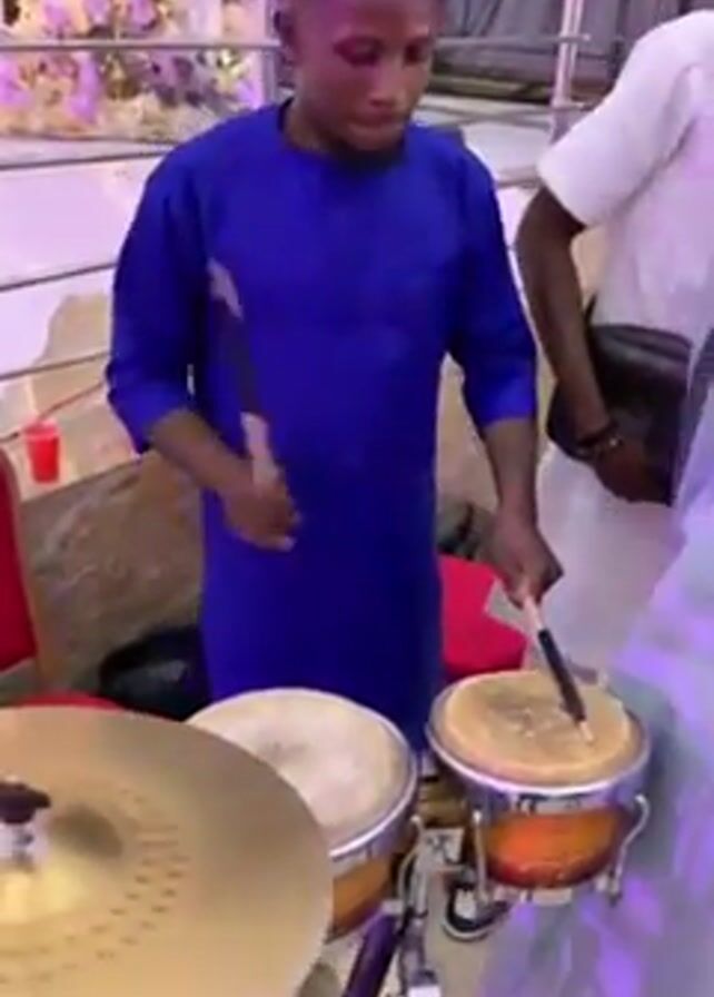 A man wearing a blue long-sleeve shirt and white sneakers stands playing a set of drums in an indoor setting. He uses two drumsticks, striking two different drums repeatedly while also tapping a cymbal to his left. To the man's right, two other people stand, both facing to the side and only partially visible. Behind the man is a red plastic cup and what appears to be a decorative floral arrangement. The floor is glossy and patterned.