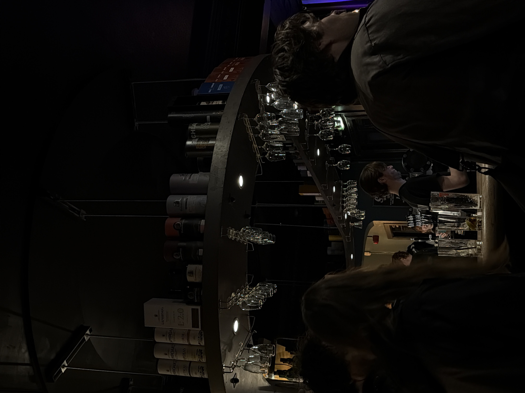 The image depicts the interior of a dimly lit bar in City of Edinburgh, United Kingdom. Centered is a large, semi-circular liquor shelf, stocked with bottles and rows of stemware. Small lights are affixed to the shelf. Three people are visible. One is at the far end of the bar, appearing to prepare drinks. Another is leaning against the bar, toward the foreground. Only the back of the head is visible. A third person is leaning in from the upper-right corner, partially obscuring the view.