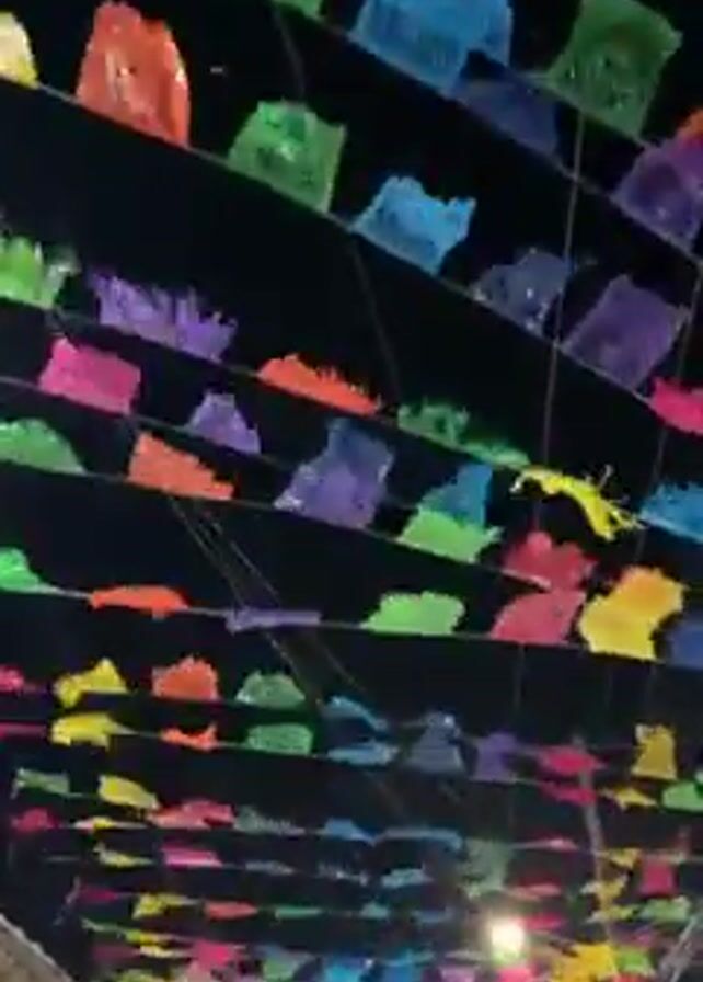 low-angle view of a street decorated with colorful papel picado banners strung overhead against a dark night sky. The banners are various colors, including red, yellow, green, blue, purple, and orange. The camera tilts upwards, revealing the multiple layers of banners stretching into the distance. Streetlights provide illumination from below.
