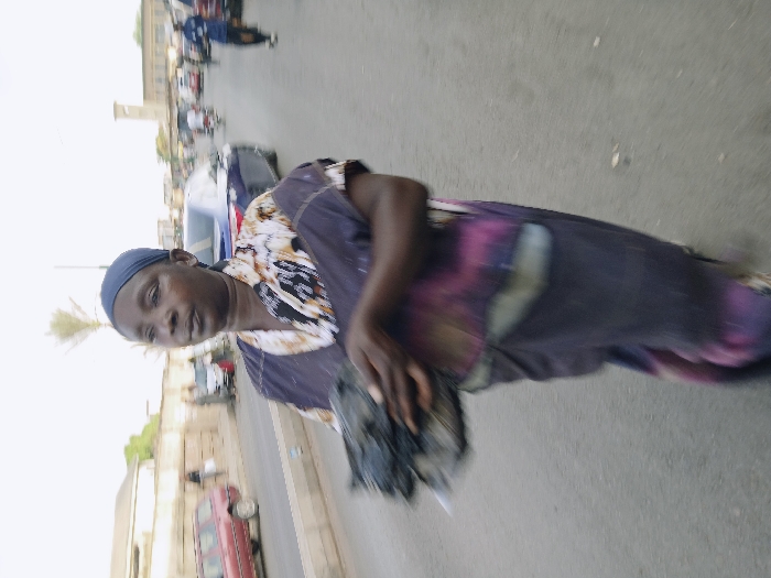 An adult female, with dark skin, stands in the foreground on a paved urban street in Gweru, Zimbabwe