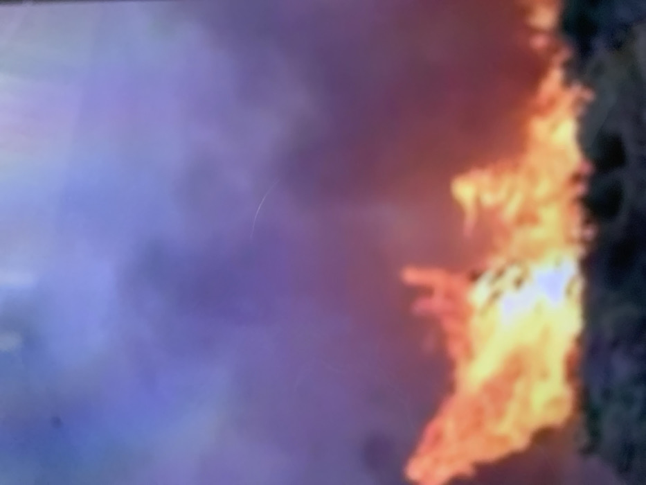 The image depicts an active fire event situated in Al-Muhajerin Municipality, Syria. A large expanse of bright orange, yellow, and red flames occupies the lower-mid section of the frame, indicating active combustion. These flames originate from an indistinct, dark ground-level area across the width of the lower image, consistent with burning vegetation or combustible debris. The flames exhibit irregular, upward-reaching shapes. Above the fire, a voluminous, dense plume of smoke rises, filling the majority of the upper two-thirds of the scene. This smoke displays colors ranging from purple and blue to dark grey. No individuals, specific man-made structures, or identifiable objects are visible within the observable scene, only the environmental phenomena of fire and smoke. The overall image quality is blurred and appears to be of low resolution.