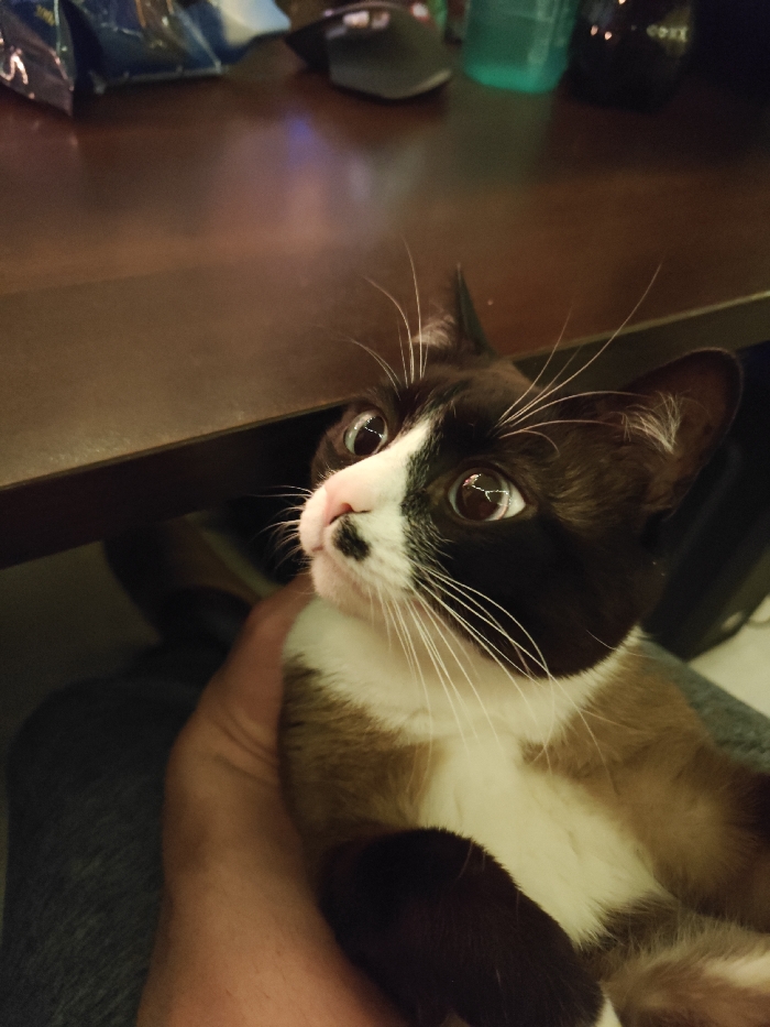 A captivating cat with unique markings gazes upward with wide, expressive eyes. Its fur is a mix of dark brown and white, with a black patch resembling a mustache on its pink nose. Held in a human hand, the cat appears curious and alert. A dark wooden table and hints of a room provide a blurred backdrop to the charming feline portrait.