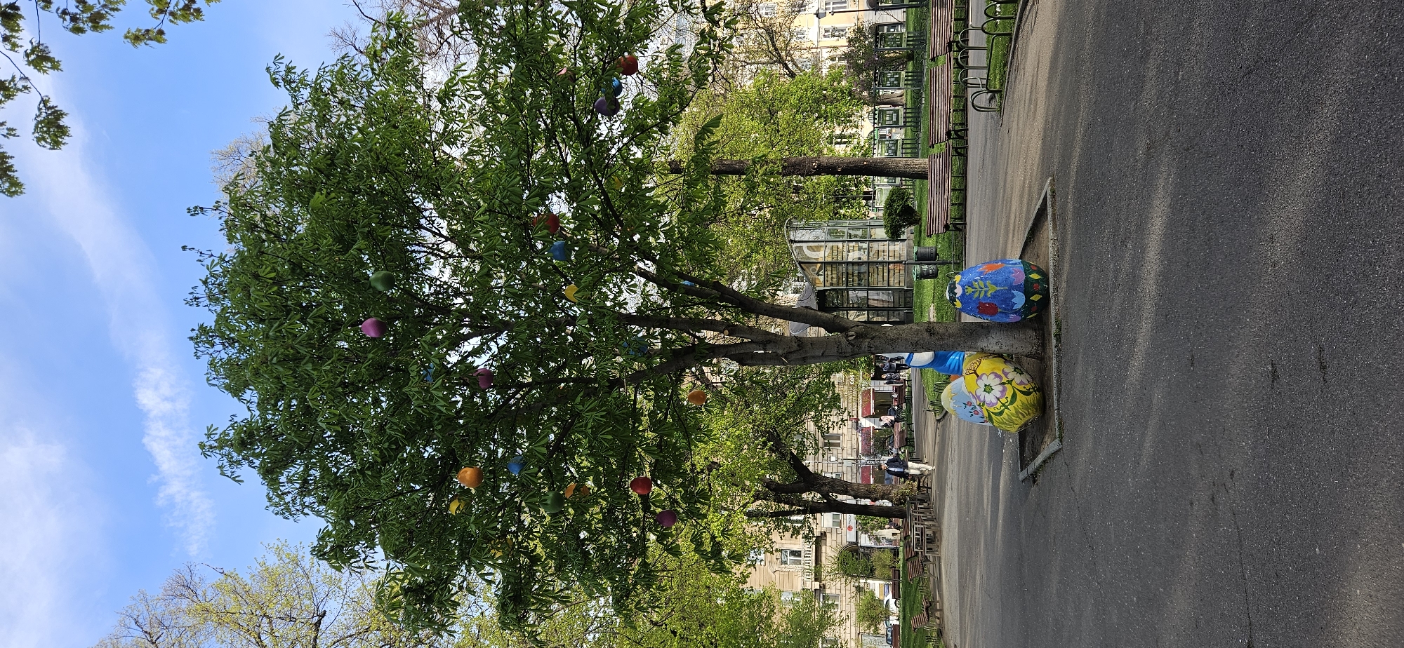 Captured in Sofia, Bulgaria, the image presents a park scene on a sunny day. A tree, adorned with colorful egg-shaped decorations, stands prominently on the left. Two oversized, painted Easter eggs rest at the tree's base. A paved pathway runs alongside the tree, with benches and bicycle racks visible. In the background, buildings characteristic of Sofia architecture can be seen. People are present in the background on the pathway. The sky is blue with a few clouds.