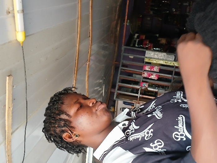 An individual is depicted in an indoor setting, identified as located in Bir Teda, Chad. The subject, an adult female with dark skin, is seen in a three-quarter profile, looking downwards and to the right. Her hair is styled in short, dark twists. She wears a black and white collared shirt emblazoned with multiple "Balmain" logos. A gold-colored earring, resembling a four-leaf clover or cross, is visible in her left ear. Her right arm and hand are in the lower foreground, engaged with a mass of dark, fibrous material, consistent with hair. The immediate background includes a light-colored, possibly corrugated metal or plastic ceiling. Wooden battens and dark electrical wires traverse the ceiling. A white pipe with a yellow end component is affixed to the ceiling in the upper right. Further back, on the right side of the frame, a metal shelving unit is partially visible, displaying small packaged items, likely hair accessories or cosmetic products. The deeper background remains indistinct but suggests further shelving or display units within a commercial space.