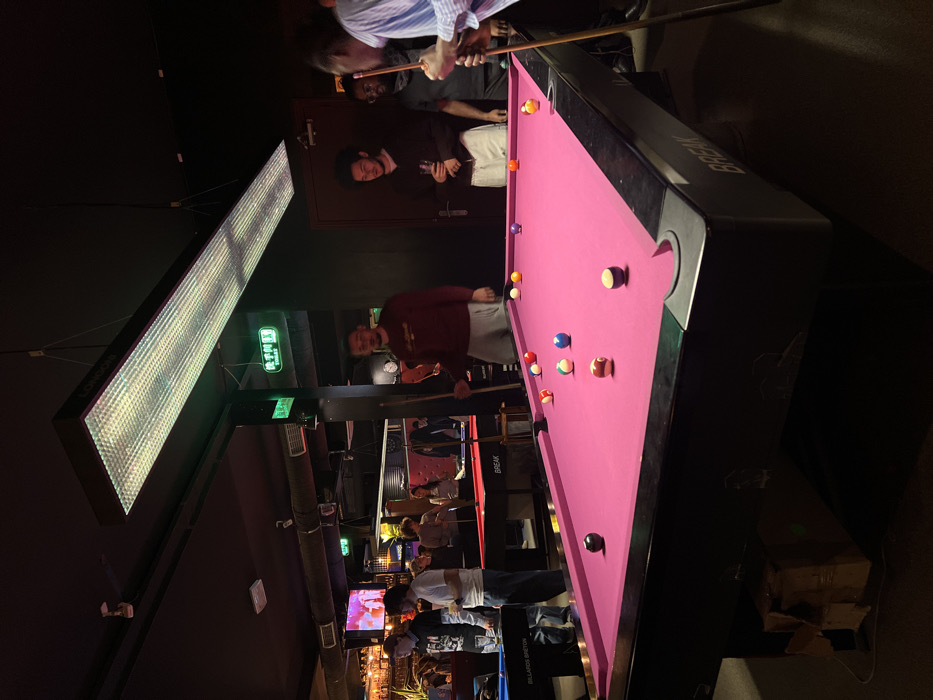 - "A dimly lit bar features a vibrant pink pool table with several balls scattered across its surface" by FM-P69hQ2, licensed under CC BY 4.0