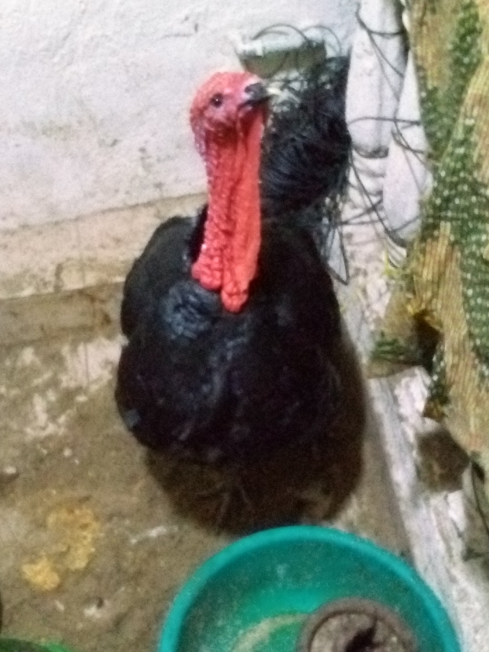 - "A black-feathered turkey with a prominent red head and wattle is observed standing in an enclosed area" by FM-30bJr1, licensed under CC BY 4.0