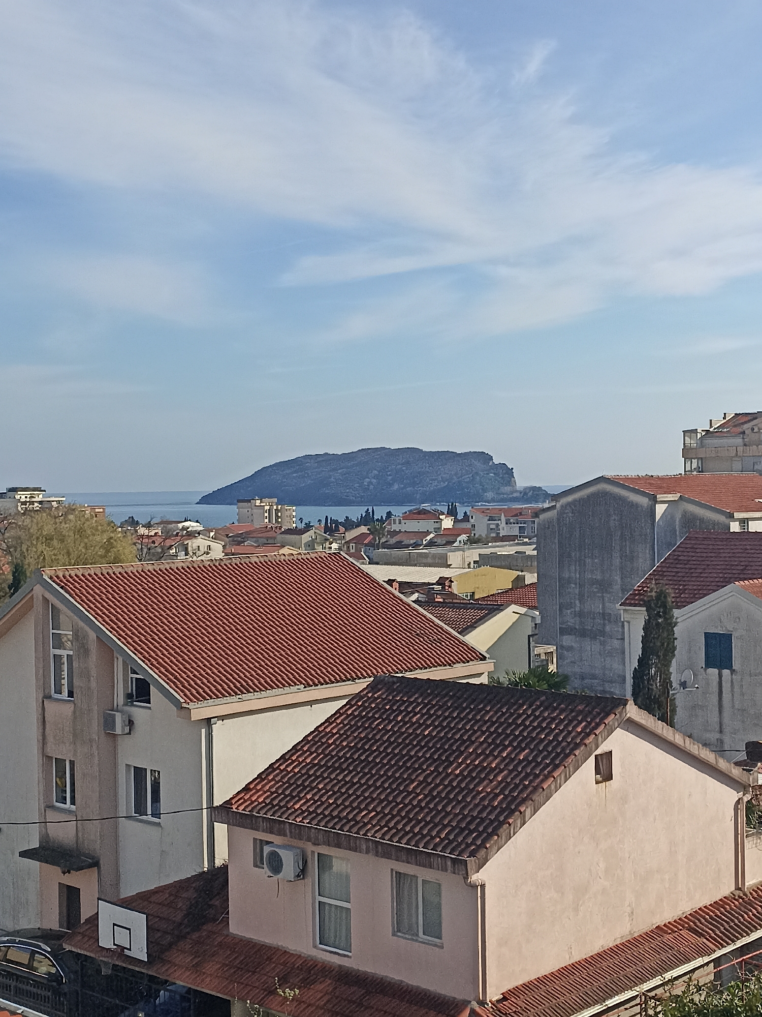 The image displays an elevated view of a residential area in Budva, Montenegro, with the Adriatic Sea and Sveti Nikola Island in the background. The sky, occupying the upper third, is light blue with scattered, wispy white clouds. The horizon line is visible where the clear blue sea meets the sky. Sveti Nikola Island, a large, dark, and rugged landmass, dominates the seascape in the distance. The mid-ground and foreground are densely populated with buildings, predominantly multi-story residential structures. These buildings are characterized by pitched roofs covered with reddish-brown terracotta tiles. Their facades are largely light-colored, ranging from beige to white, with some areas of weathered grey concrete. Numerous rectangular windows, many with white frames, are visible. Exterior air conditioning units are mounted on several building walls. In the lower-left, a white basketball hoop with a net is attached to the roof of a lower building extension, beneath which a dark-colored vehicle is partially visible behind a black metal fence. Utility lines traverse the scene between structures. Sparse trees and shrubs are interspersed among the buildings, and a tall, slender conifer stands near the center-right. No individuals, discernible actions, or interactions are visible within the frame. The scene is illuminated by daylight.