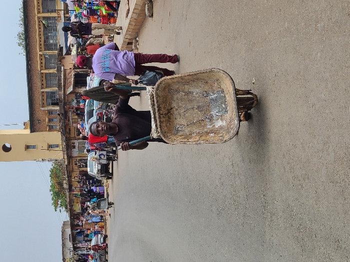 The image displays an active outdoor street scene within a bustling commercial district of an unknown city. In the foreground, a young Black male, appearing in his late teens or early twenties, stands centrally, pushing an empty, heavily weathered and rusty wheelbarrow with green handles. He is wearing a dark short-sleeved t-shirt and dark trousers, and is looking directly at the camera. The asphalt road surface beneath him shows signs of wear. To the right of the central figure, on a raised concrete sidewalk, a male subject wearing a light purple t-shirt with a graphic, maroon trousers, and a red baseball cap walks away from the camera, carrying a black plastic bag in his left hand. Further along this sidewalk, another male subject in a dark shirt and light trousers is also walking away from the camera, holding a small object. The street is lined with various market stalls on both sides, displaying a wide assortment of goods including clothing and brightly colored plastic household items. Multiple people are visible walking, standing, and interacting with the market environment. Vehicles, including cars and a scooter, are present on the road and parked along the street. In the background, a prominent, multi-story building of light yellow or ochre color stands out. This structure features a distinct tower on its left side with a circular opening near the top and several rectangular windows. Surrounding this building are less uniform structures housing additional market stalls. The sky above is uniformly overcast.