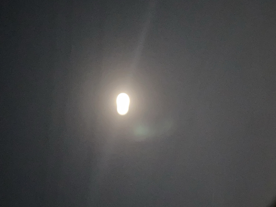 The image displays a singular, intensely bright, elongated light source centrally positioned against a uniformly dark, monochrome gray background. The light appears horizontally oriented, emitting a diffuse white-yellow glow surrounded by a subtle halo, with a faint greenish lens flare visible to its lower left. The background is featureless, suggesting a nighttime environment or heavily obscured sky conditions. No individuals, identifiable objects, specific actions, or interactions are visible within the frame. This scene is depicted within the city of Jos, Nigeria.