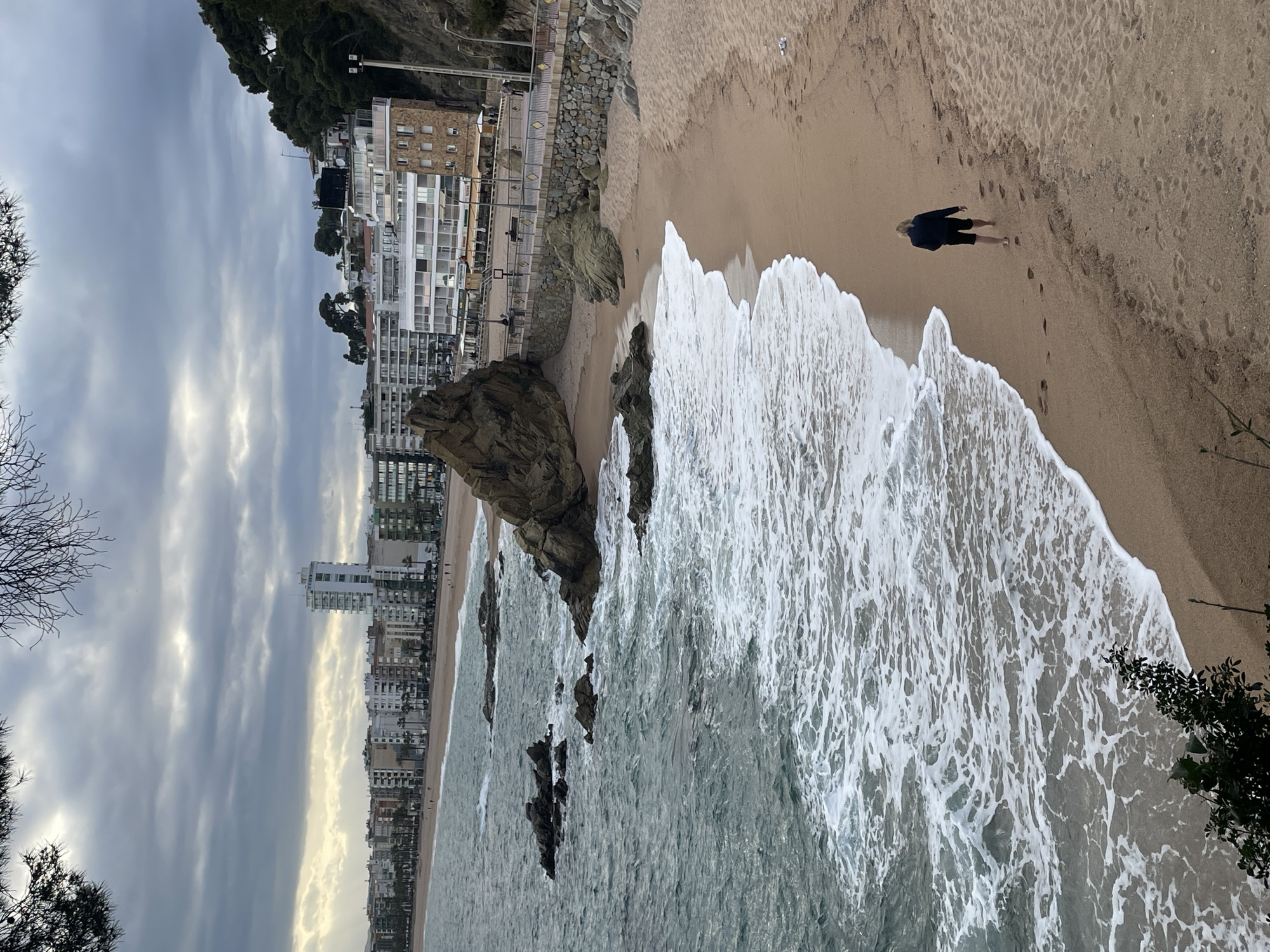 This image depicts a coastal scene in Lloret de Mar, Spain, under an overcast sky. The view is from an elevated position looking down and across a sandy beach towards a built-up urban area. In the foreground, the upper left quadrant shows dark, bare tree branches and some green pine needles. The bottom left features dark green foliage. The midground is dominated by the Mediterranean Sea on the left, exhibiting choppy, turquoise-grey water with white foam from breaking waves. Numerous dark, jagged rock formations are visible both submerged and emerging from the water, extending onto the beach. A prominent, large dark rock formation is central on the coastline. The sandy beach is light brown, curving along the shore. One individual, seen from behind, walks barefoot on the wet sand towards the upper right, leaving a trail of footprints. This person wears dark shorts and a dark, long-sleeved top. Adjacent to the beach and further back, a paved promenade with a light-colored stone retaining wall and metal railings is visible. Several streetlights line this promenade, and multiple indistinct figures are walking or standing on it. The background features a dense strip of multi-story buildings, predominantly white or light-colored, lining the beachfront. A tall, slender white high-rise building stands out towards the left of the urban strip. To the right, a steep, tree-covered hillside, primarily coniferous, rises behind the promenade and lower buildings, with additional structures nestled into its slopes. The sky is heavily overcast with dense grey clouds, although brighter patches are visible on the horizon, suggesting diffused sunlight. The overall lighting is subdued.