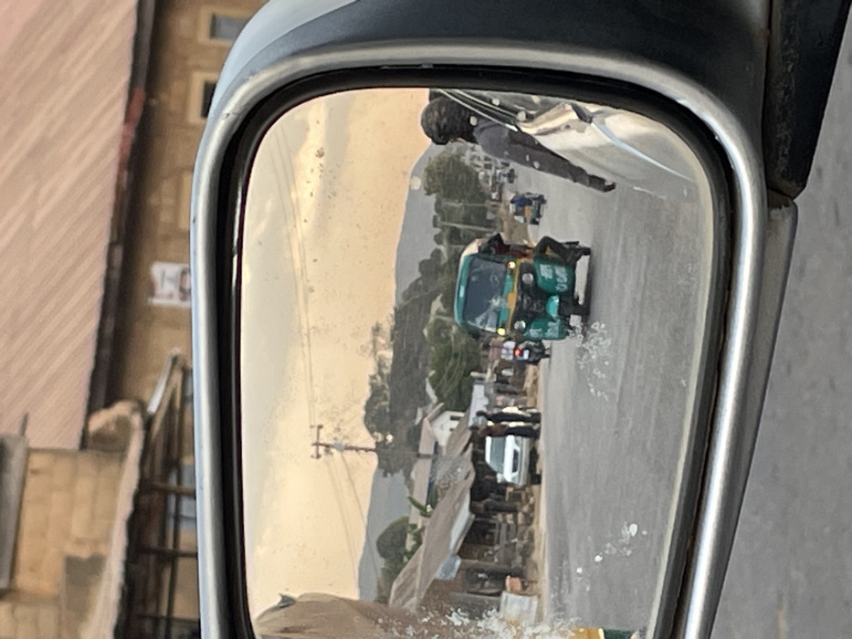 - "The image displays a street scene on Rukuba Road, Nigeria, captured through a dirty, passenger-side rearview mirror" by FM-PjuW22, licensed under CC BY 4.0
