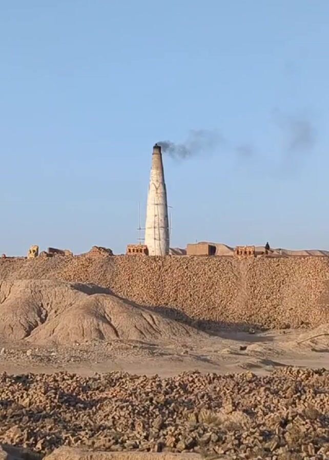 landscape with a brick kiln in the background. The kiln is a tall, white, cone-shaped structure emitting black smoke from its top. It sits atop a mound or wall of bricks. In the foreground, the ground is covered with uneven, reddish-brown material, likely broken or unfinished bricks. The sky is a clear, light blue. There are a few small buildings and what appear to be figures on top of the brick mound, along with a small yellow vehicle. The scene has a dry, dusty appearance.