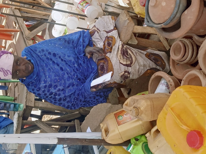 An outdoor market stall in Communauté rurale de Payar, Senegal, is depicted in daylight. A woman, appearing middle-aged to elderly with dark skin, is seated on a low wooden stool, looking directly at the viewer with a neutral expression. She wears a light pink and white patterned head wrap, a bright blue shawl with white circular patterns, and a light-colored patterned skirt. Her right hand holds a small white object. To her immediate left and in the foreground, a collection of plastic jerrycans in yellow, beige, and green are displayed, one beige jerrycan bearing a "100%" label. To her right and in the foreground, numerous terracotta pottery items, including bowls of various sizes, some stacked, and a lidded pot with a grey rim, are arranged. Behind her on the right, white plastic cups are vertically stacked on a display stand. The background shows wooden structures of other market stalls and partial views of other individuals, all set against a dry, earthen ground.