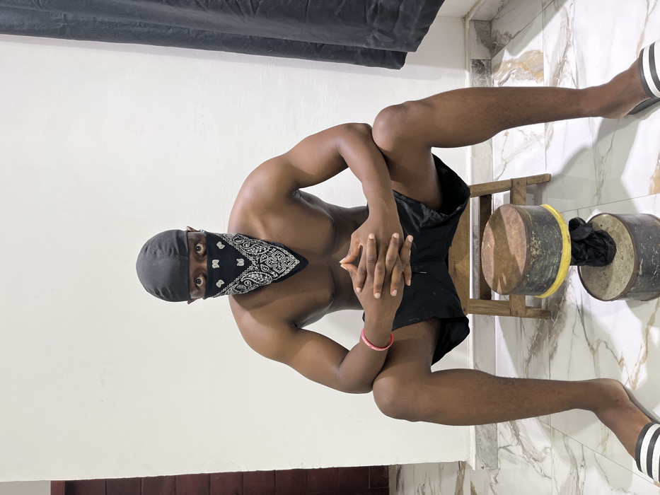 In Joma, Ghana, an adult male is seated indoors, directly facing the viewer. He wears a black durag and a black bandana with a white paisley pattern, obscuring his lower face and revealing only his wide-open eyes. His bare torso exhibits a muscular build, with a red bangle on his left wrist. His hands are clasped in front of his abdomen. He wears black athletic shorts; his left foot has a black and white striped slide sandal, while his right foot is bare. He sits on a simple, light brown wooden stool. Beneath the stool, a homemade dumbbell, comprising two dark cylindrical weights connected by a yellow-wrapped bar, rests on the floor. The background is a plain white wall, with a dark wooden door frame visible on the left and a dark curtain on the right. The floor is white marble-patterned tile.