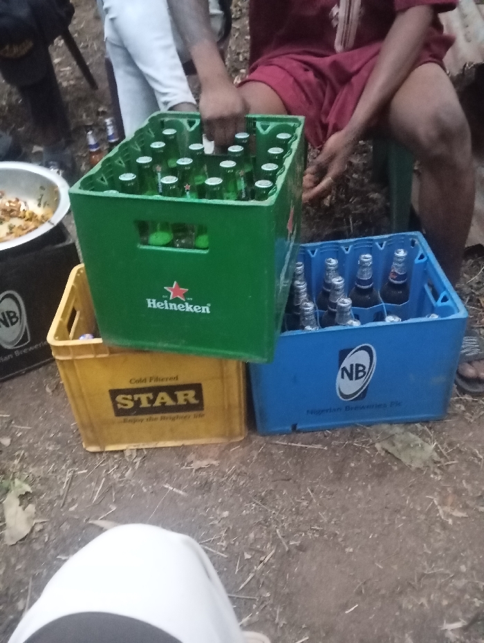 Three crates of bottled beverages, stacked unevenly, sit on bare ground. The top crate, green and bearing a "Heineken" logo, is full. Below it, a yellow crate displays "STAR," while a blue crate labeled "NB" sits to the side. Partially visible people flank the crates, one wearing a maroon outfit and sitting on a green stool. There's also an individual wearing white pants with tattooed arms. A metal bowl filled with food is to the left, on a black crate.