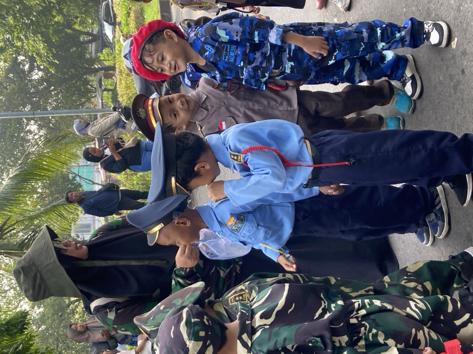 A group of children, dressed in military and police costumes, stand in a line. One child wears a red beret and blue camouflage. Another is dressed as a brown-uniformed officer, with a cap. Two children are in light blue uniforms with peaked caps. In front of the children are adults in civilian clothing and camouflage military gear. Some adults appear to be taking photographs. A tree and building are in the background.