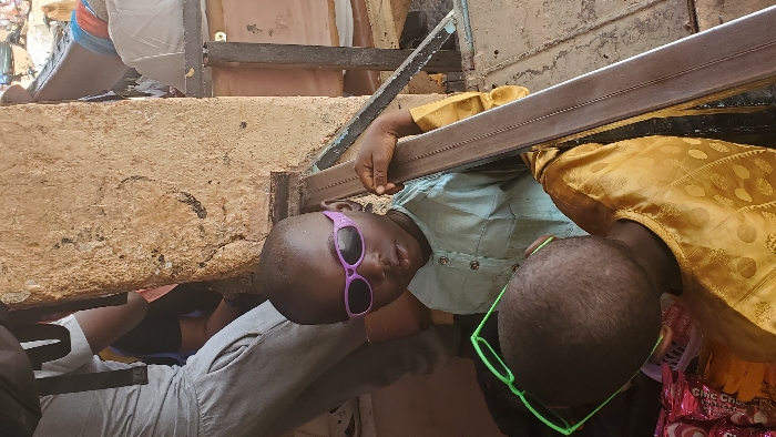The scene is set within a commercial area in Jos, Nigeria, featuring two young children and elements of a market environment. In the center, a child of African descent wears a light blue, collared, long-sleeved shirt with buttons and purple-framed sunglasses. He faces forward with his mouth slightly ajar, and his right hand grips a horizontal, dark brown metal bar to his right. In the lower foreground, another child, seen from behind and to the left of the first, wears a yellow patterned long-sleeved shirt. Green-framed glasses rest on the back of this child's head as he looks down towards a display of reddish-pink "Choc Choc" snack packages. A prominent, rough-textured, tan-colored pillar or wall stands vertically in the mid-ground, separating the children from partially visible adults in the background. An adult in a grey t-shirt and grey pants is discernible in the upper left background. The overall environment suggests an indoor or semi-outdoor market stall, with hints of a busier outdoor market further in the distance.