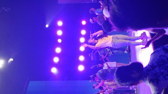 An indoor event in Santiago de Surco, Peru, is depicted under pervasive purple stage lighting. A female individual, with long dark hair and glasses, wearing a light-colored t-shirt with text and light blue jeans, stands centrally on a stage. She holds a black microphone to her mouth with her left hand and has her right hand raised with fingers spread, palm facing the audience. Behind her on the stage, multiple individuals are visible; some have their hands raised, while others are positioned with musical instruments including at least two electric guitars and a keyboard stand. A person to the right wears a baseball cap. The background features a large blue wall or screen, illuminated by two horizontal rows of bright, circular stage lights, totaling at least six visible lights. In the foreground, from the audience perspective, the back of a person's head and shoulders, wearing a dark patterned shirt with hair styled in a bun, is visible on the left. On the lower right, a human hand with the palm facing upwards is visible. Numerous other indistinct heads are visible in the audience section.