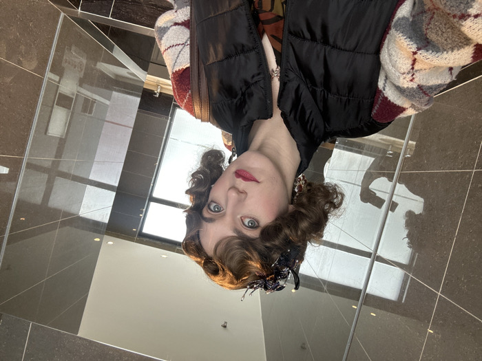 A female individual is depicted in a selfie taken within a modern public restroom in Huangdao District, China. The subject has light skin, blue-green eyes, and dark red lipstick on her lips. Her brown hair is styled in prominent curls, adorned with a dark, beaded accessory on the right side of her head. She wears reddish earrings, a black puffer vest over an argyle-patterned sweater in red, white, and gray, and an underlying patterned top. A brown bag strap is visible over her right shoulder. The background consists of large, dark brown or charcoal-colored glossy wall tiles, which reflect the individual holding a smartphone to capture the image. A large window to the left reveals a bright exterior view, likely an overcast sky or an outdoor structure. Reflections on the tiled surfaces also show a white sink with a chrome faucet on a dark countertop, and a light-colored ceiling with recessed lighting.