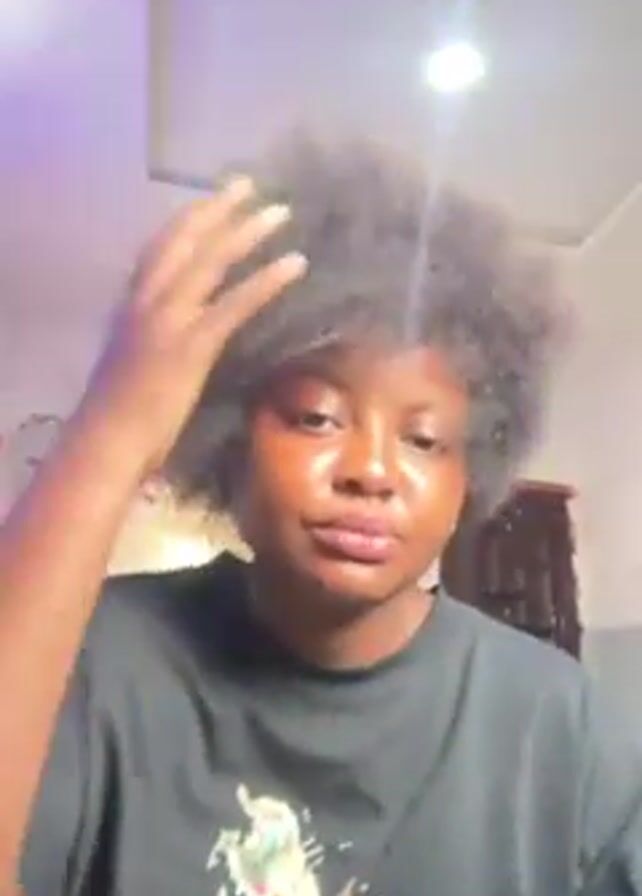 two individuals in separate scenes. Initially, a young woman with Afro-textured hair is seen wearing a black graphic t-shirt. She is facing the camera, and briefly makes a peace sign. Later, a young man, shirtless and lying on a bed with an arm behind his head, is shown. The background in both scenes is a simple interior setting with painted walls and light fixtures visible.