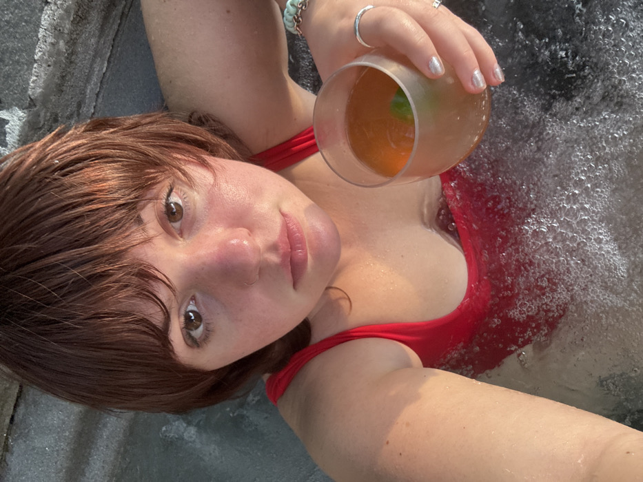 A woman with brown hair and eyes poses in a hot tub while holding a glass of amber-colored liquid. She wears a red bathing suit and turquoise and silver jewelry. Her hand has several silver rings and glittery nails. Bubbles surround her chest in the water. She looks up at the camera with a relaxed expression.