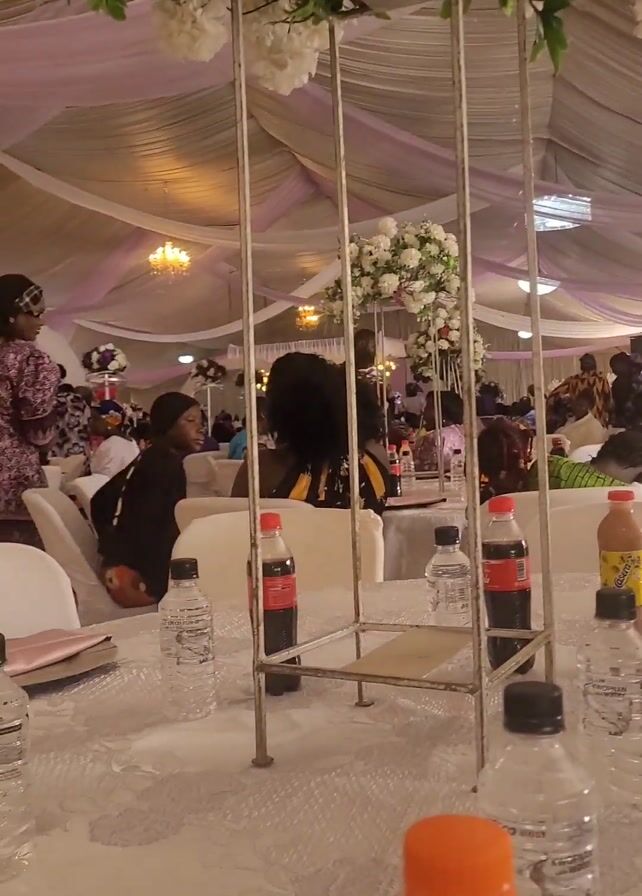 n indoor event, possibly a wedding reception, in a large room with a white tent ceiling decorated with white and purple fabric. Numerous round tables are set with white tablecloths, water bottles, soda, and orange juice. A metal centerpiece with white floral arrangements sits on the table in the foreground. Several people, mostly women, are seated or standing around the tables, dressed in colorful clothing. The room is brightly lit, with chandeliers visible in the background. Background music is playing.