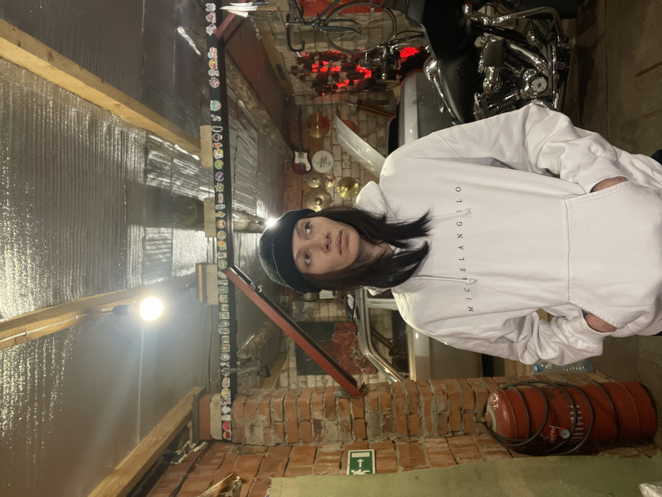 An indoor garage or workshop space in Oktyabr'skii, Russia, is depicted. A person with long, dark hair stands centrally, wearing a black knit beanie and a white hooded sweatshirt with "MICHELANGELO" printed in black text across the chest. The individual has a septum piercing and a piercing in their left nostril, and their hands are placed into the front pouch pocket of the sweatshirt. Their gaze is directed towards the viewer's right with a neutral expression. The environment features brick walls on the left, displaying a green exit sign with a white running figure and arrow. Below the sign is a red cylindrical tank, wrapped with a black hose, with a pressure gauge visible on its side. The ceiling consists of exposed wooden beams and a silver, reflective insulation material. A single bare light bulb hangs from the ceiling, illuminating the scene. A horizontal black beam, positioned across the mid-distance of the ceiling, is adorned with numerous small, distinct stickers or badges. In the background, a light-colored sedan is partially visible behind the individual and a brick pillar. To the right, a black motorcycle with chrome engine components and a black fuel tank is present. Further to the right, a collection of cymbals are visible on a stand, and a red electric guitar is mounted on the wall above them. A bicycle is partially visible hanging near the far right. Red lighting or reflective elements are also present in the far right background. An angled red structural beam or pull-up bar extends upwards from the left brick wall.
