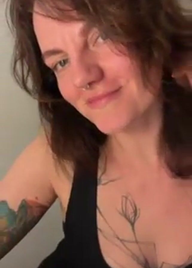 A woman with shoulder-length, wavy brown hair, wearing a black tank top, is dancing to music. She has several visible tattoos, including one on her left arm and another on her chest. She has a nose ring. The background is a plain white wall. She moves her arms and body to the rhythm of the music, smiling slightly at times.
