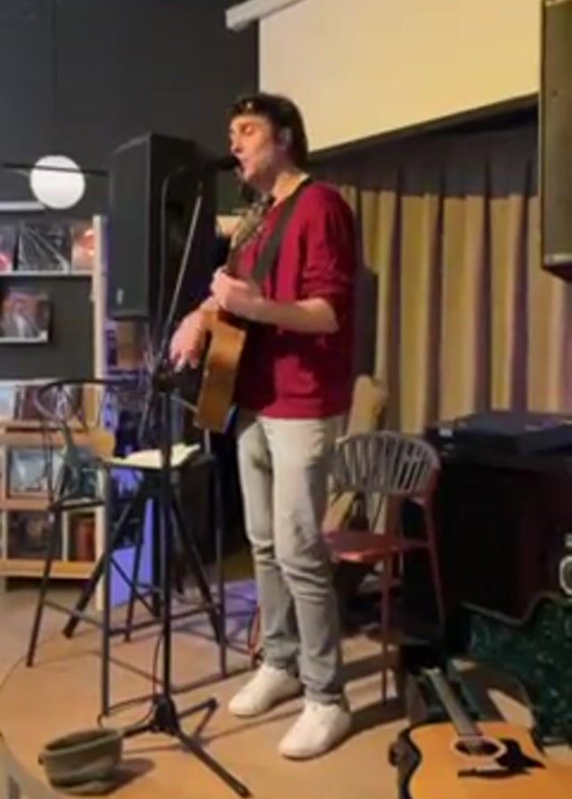 A man is standing on a small stage performing music. He is playing an acoustic guitar and singing into a microphone. He is wearing a long-sleeved red shirt, light gray jeans, and white sneakers. The stage is circular with a metal railing around the edge. Behind him is a curtain, and to his right is a sound mixing board and another acoustic guitar in its case. To his left, there are record albums on shelves, a microphone stand, and a speaker. The room has a contemporary style with black walls and a speckled ceiling. There is a single globe light hanging from the ceiling.