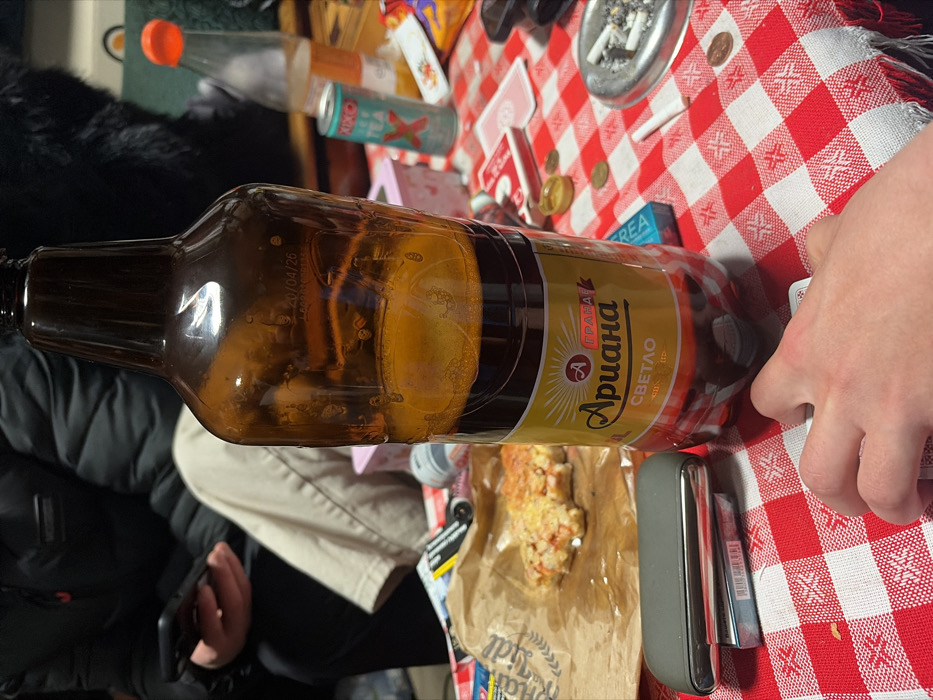 The scene depicts an indoor, casual gathering situated on a red and white checkered tablecloth in Kardzhali, Bulgaria. In the immediate foreground, a person's fair-skinned hands are holding playing cards, indicating an ongoing game. To the left, a silver electronic device rests on a blue cigarette pack, branded "FREE." Adjacent to these items is a brown paper wrap containing a partially consumed, irregular-shaped piece of pizza or focaccia topped with melted cheese and red sauce. A large, amber-colored plastic bottle, approximately half-full of a light-colored liquid, stands prominently. Its label identifies the product as "Ариана СВЕТЛО" (Ariana Light) beer. Various items are scattered across the tablecloth: a yellow bottle cap, several Bulgarian coins, a blue packet, a white cigarette filter/butt, and a metallic ashtray filled with multiple cigarette butts and ash. Two distinct packs of playing cards, one red and one pink, are also visible. In the mid-ground, to the left, another individual is partially visible, wearing a dark, padded jacket and light-colored trousers. This person is engrossed in a dark-colored smartphone held in their left hand. Further in the background, a transparent bottle with an orange cap containing an amber liquid, and a light blue can labeled "XIXO Ice Tea X," are present on the table. Elements of a pink box and a dark, possibly fur-trimmed garment belonging to another individual are discernible in the deeper background. The environment is consistent with a relaxed, social indoor setting.