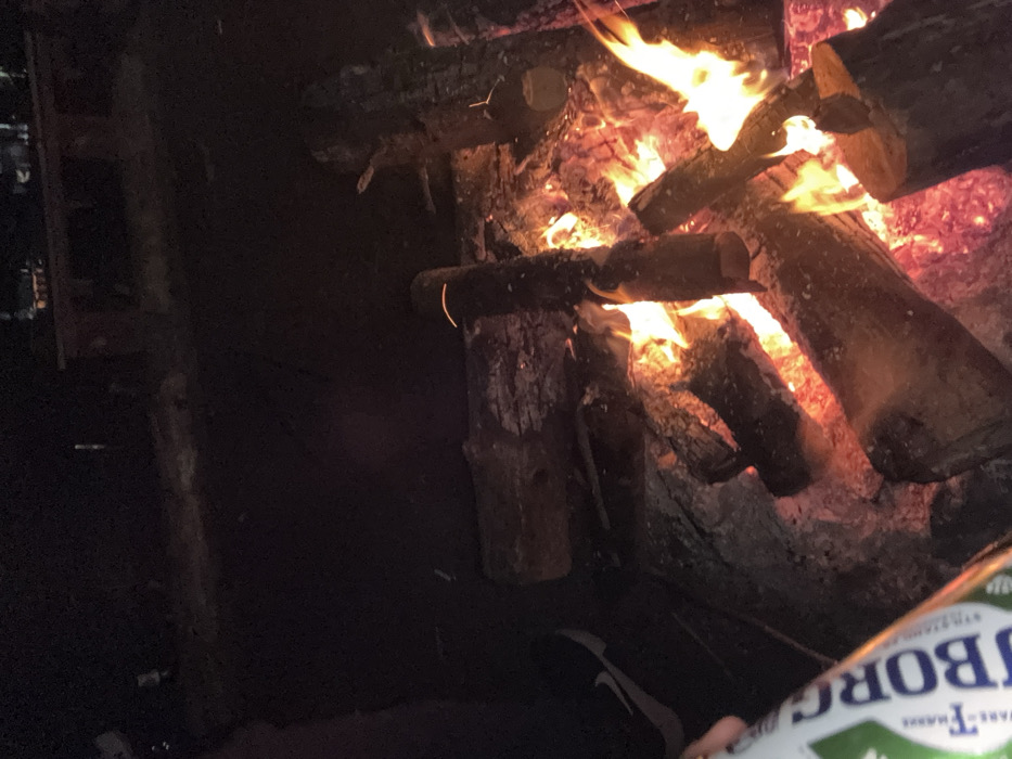 The scene depicts a nighttime outdoor gathering in Pancharevo, Bulgaria, centered around a substantial bonfire. Numerous logs are actively burning, emitting bright orange and yellow flames and glowing red embers, illuminating the immediate area. Ash and partially consumed wood are visible within the fire pit. In the lower left foreground, a person's left leg is visible, wearing a dark shoe with a white Nike swoosh. This individual is holding a light green and white Tuborg beer can, partially obscuring the bottom left corner of the frame. Suspended above or near the flames, attached to a stick or log, is a dark, cylindrical object, possibly a small pot or kettle. The background is predominantly dark, but faintly discernible wooden picnic tables and benches are present in the upper right, suggesting a designated recreational area. The ground surface appears to be natural earth or gravel.
