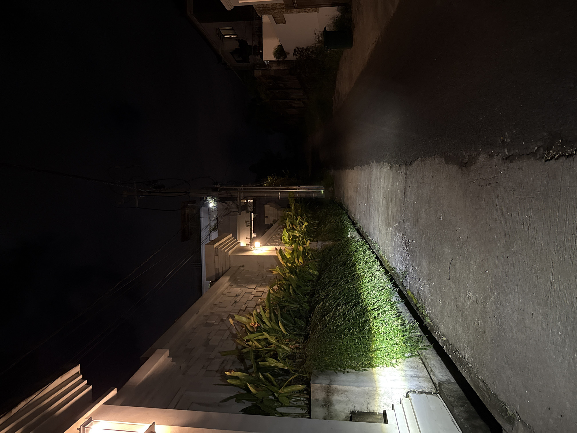 A street in Kutuh, Indonesia at night, with a concrete road surface illuminated by a single light source
