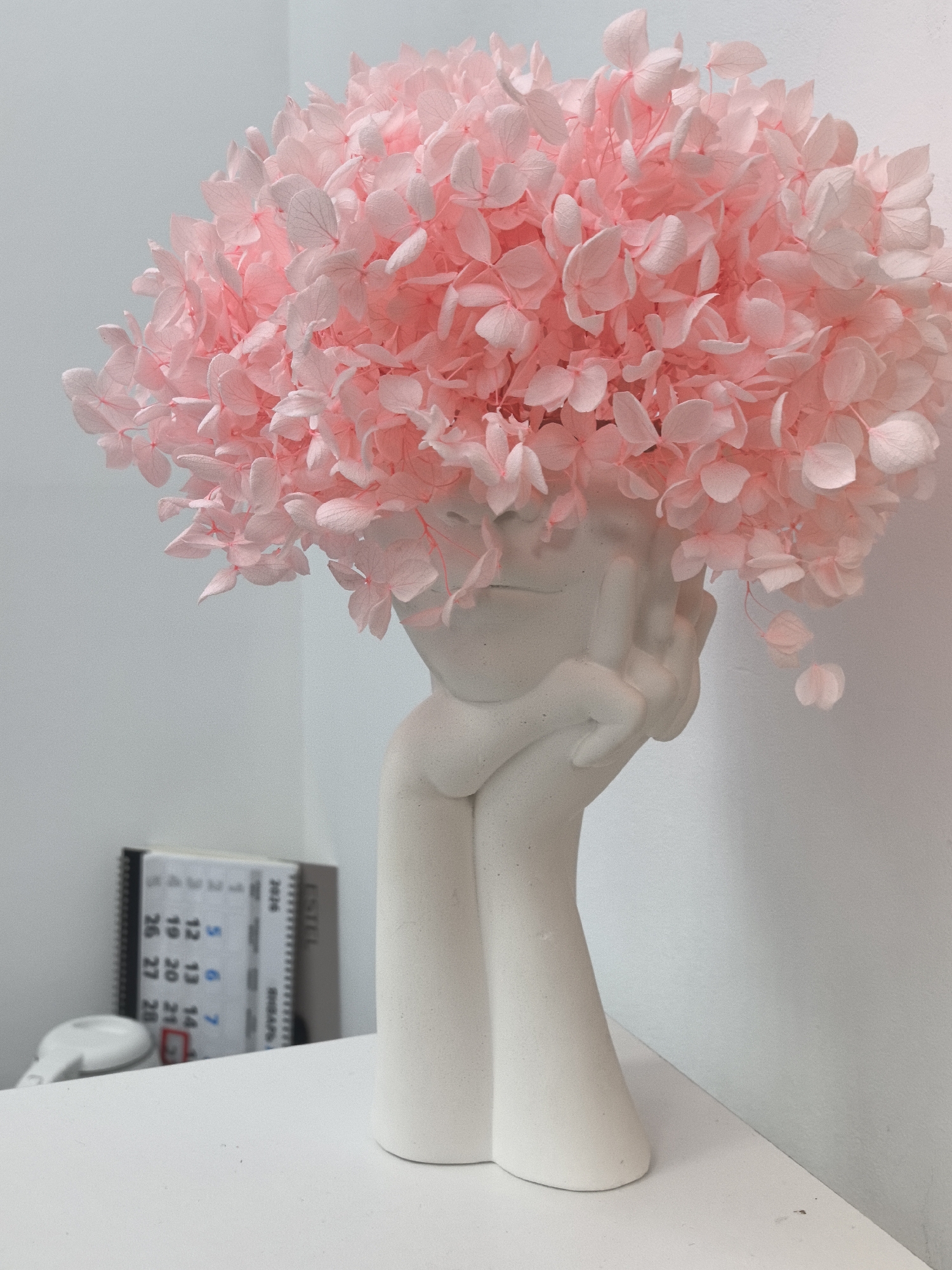 The scene, located in the city of Chaikovsky, Russia, depicts an indoor environment. A white, matte sculptural vase, abstractly shaped like a human head being supported by hands, occupies the center-right foreground. Emerging from the top of the vase is a dense cluster of light pink preserved hydrangea petals. The vase rests on a flat, white surface. To the left, in the mid-background, a vertical desk calendar for the year 2024 is visible, displaying numerical dates with specific dates marked, and partially showing the brand name "ESTEL." A small white object, possibly an electronic device, is positioned on the white surface near the calendar. The background consists of plain white walls. No individuals are present, and no actions or interactions are depicted.