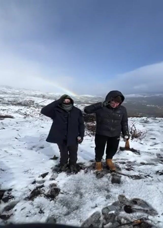 Two individuals stand in a snow-covered landscape under a partly cloudy sky with a rainbow visible in the background. Both are wearing winter clothing, including jackets and gloves, appropriate for the cold weather. The person on the left has their face partially covered, and the person on the right is wearing a hooded jacket. They raise their arms, seemingly waving or gesturing towards the camera or the surrounding scenery. The ground is covered with snow, and some sparse vegetation is visible in the snowy landscape. The setting appears to be on a high vantage point, possibly a mountain top, given the panoramic view of the surrounding terrain.