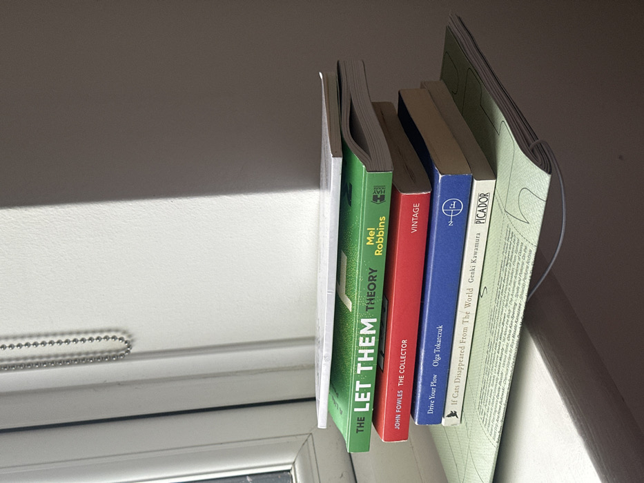 This image depicts a stack of five books resting on a light green paper or notebook, positioned on a windowsill or similar surface in an indoor setting within Wealden, United Kingdom. Strong sunlight enters from the left, illuminating the left side of the scene and casting a distinct diagonal shadow across the right-hand wall and portions of the book stack. From top to bottom, the books are: 1. A light-colored, possibly white, softcover book with its cover slightly arced upwards. 2. A green book titled "THE LET THEM THEORY" by Mel Robbins, published by Hay House. 3. A red book titled "THE COLLECTOR" by John Fowles, published by Vintage. 4. A blue book, partially obscured, with visible text "Drive Your Plow Olga Tokarczuk," likely referring to "Drive Your Plow Over The Bones Of The Dead." 5. A cream-colored book titled "If Cats Disappeared From The World" by Genki Kawamura, published by Picador. To the left of the books, a white window frame is visible, partially revealing a muted outdoor view. A silver-colored beaded chain, likely for a window blind, hangs vertically on the white wall adjacent to the window. The wall itself transitions from bright illumination on the left to a deep shadow on the right due to the direct light source. No individuals or active interactions are present in the scene.