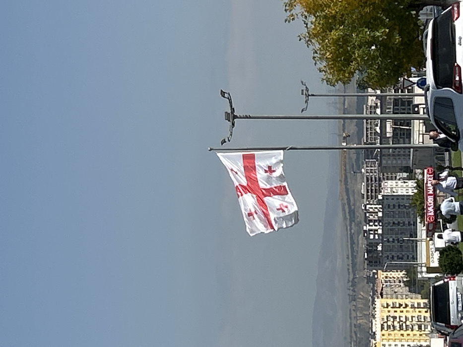 The image displays an urban scene in Rustavi, Georgia, under a clear, pale blue sky with a distant hazy mountain range on the horizon