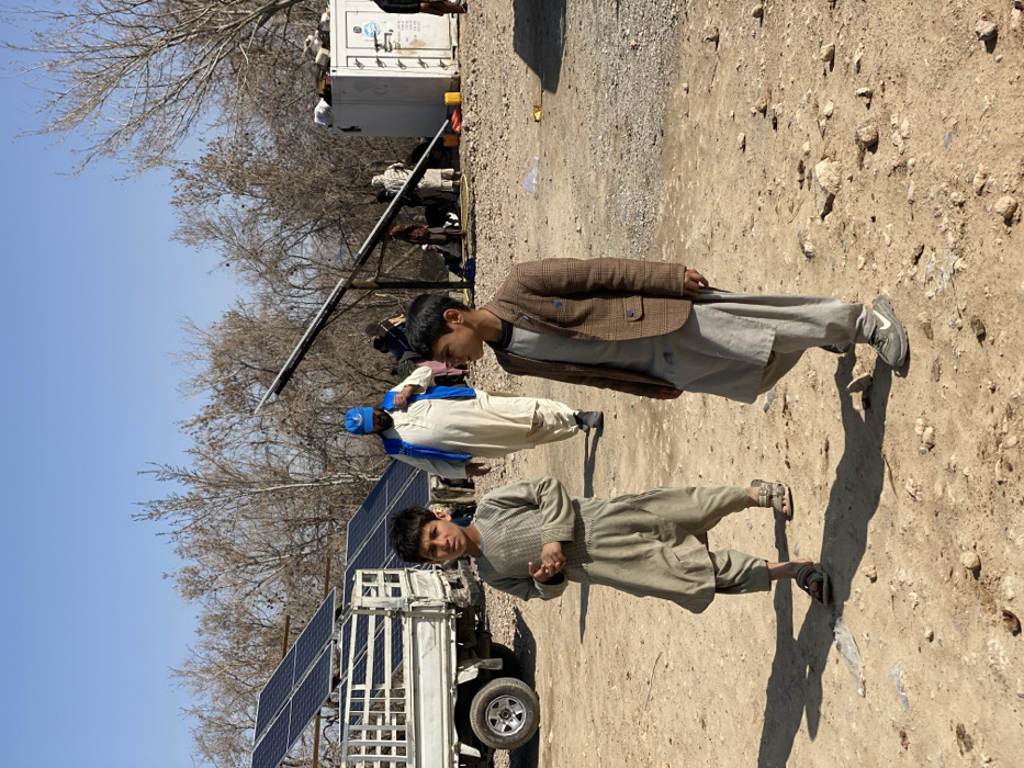 Two young males stand on a gravelly surface, one wearing a brown checkered jacket over a pale tunic and black sneakers, the other in a grayish tunic and sandals. Behind them, a white truck bed supports solar panels. Other people are visible in the background, along with utility equipment and bare trees against a pale blue sky.