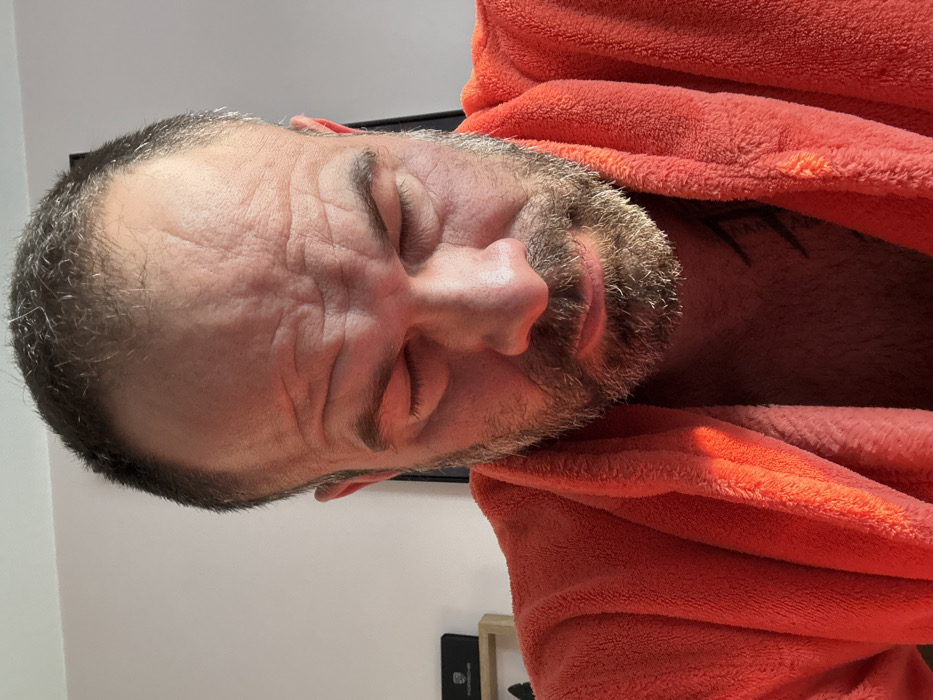 The image depicts a male individual, appearing to be in his 40s or 50s, with short, receding dark-grey hair and a full beard. His eyes are closed, and his gaze is directed downwards. He is wearing a bright orange, textured, fluffy robe, which is open at the chest, revealing bare skin and a portion of a dark tattoo on his left shoulder/chest area. The subject's forehead exhibits prominent wrinkles. Warm, reddish-orange light illuminates the scene, particularly his face and the right side of his robe. The background consists of a light-colored wall. To the left of the subject, a wooden shelf holds a black rectangular box displaying a "PORSCHE" logo. Below the shelf, a dark, indistinct object is partially visible. A dark vertical element is present on the right side of the background. The scene is an interior setting, located in Marche-en-Famenne, Belgium. The individual is stationary, with no immediate action or interaction depicted.