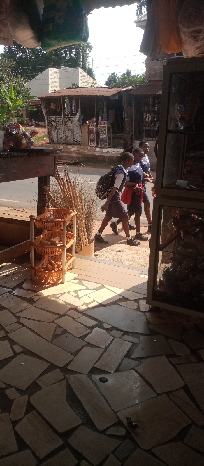 The image depicts a sunlit street scene in Ogidi, Nigeria, viewed from the shaded entrance of a commercial establishment. In the immediate foreground, the floor is paved with irregular light-colored flagstones, showing areas of strong sunlight and deep shadow. To the left, an orange three-tiered plastic rack displays multiple round, brown baked goods. Adjacent to this rack, a bundle of long, thin, light-brown sticks stands upright. On the far right, a dark-framed display case containing various packaged items is partially visible. In the midground, three young females, identified as schoolgirls by their dark blue or black uniforms worn over white shirts, walk from left to right on an unpaved sidewalk bordering a paved road. The leftmost girl carries a dark backpack. The middle girl has a red garment draped over her left arm. All three wear dark shoes with white socks. Across the paved road, a row of simple market stalls with corrugated metal roofs display assorted merchandise. Behind these stalls, a light-colored building with a distinct multi-faceted or pyramidal roof is visible, surrounded by green foliage. Overhead, sections of a corrugated roof overhang and several hanging bags (one green, one white, one orange) are present.