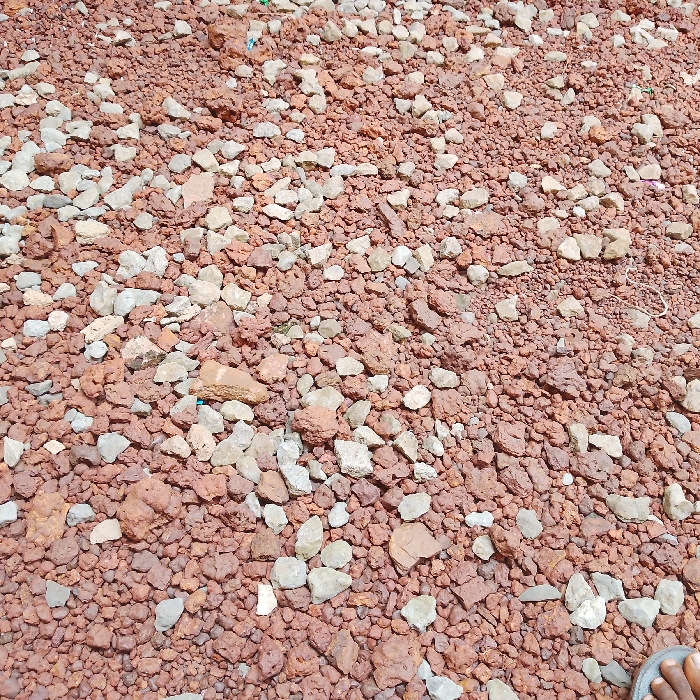 The image presents a close-up, downward-angled view of an unpaved ground surface in Nsukka, Nigeria. The terrain is covered by a dense accumulation of small, irregularly shaped stones and gravel. The predominant material is reddish-brown, consistent with lateritic soil and rock fragments, mixed with numerous lighter-colored, grayish-white stones. The sizes of these aggregate materials vary, generally ranging from small pebbles to larger fragments of approximately 5-10 cm. Minimal extraneous debris, including small blue and green plastic fragments, is visible embedded within the gravel. In the bottom right quadrant, the toes and the edge of a dark-colored sandal worn by a dark-skinned human foot are partially visible, indicating the presence of an individual standing on or very near this surface. No other subjects, actions, or interactions are discernible.