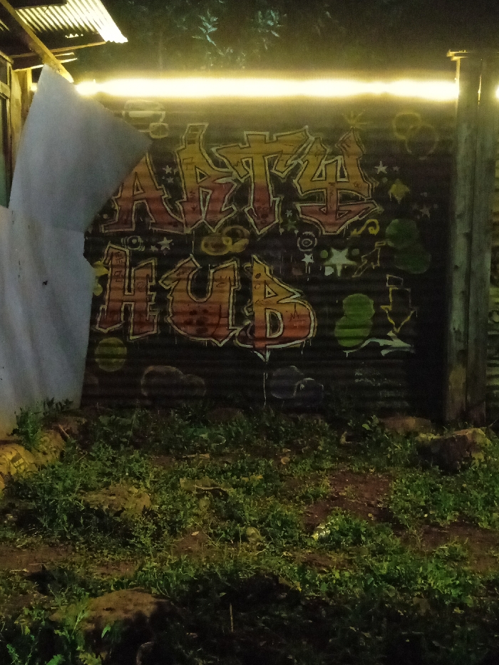 Graffiti art on corrugated metal, spelling "Art Hub," stands behind a bed of green vegetation. The letters are in orange and yellow with dark outlines. Stars and circles are painted around the words. A bright light shines above the graffiti. A white tarp covers part of the left side. The ground is uneven with dirt and rocks amongst the vegetation. The setting appears to be outdoors at night.