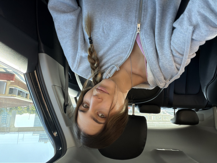 A young female, appearing to be in her late teens or early twenties, is seated in the front passenger seat of a vehicle