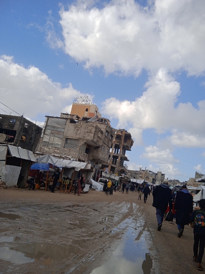 - "The image captures a damaged street scene in Khan Yunis, Palestinian Territory, under a sky with significant white clouds and patches of blue" by FM-taMrd2, licensed under CC BY 4.0