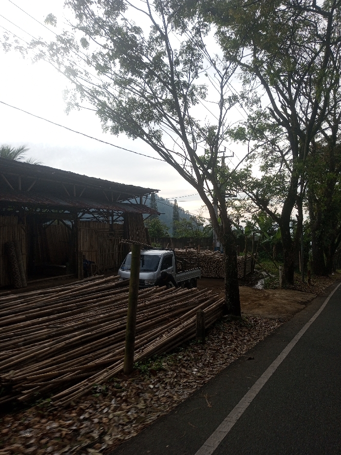 The image depicts an outdoor industrial or storage area in San Pya, Myanmar, observed from a low-angle perspective. In the foreground, numerous light-colored, long bamboo poles are horizontally stacked on the ground, partially covered by fallen brown leaves. A two-lane asphalt road with a solid white edge line runs along the right side of the frame. To the left of the road, a silver single-cab pickup truck is parked facing right, positioned in front of a large, open-sided structure. This structure features a dark corrugated metal roof supported by wooden posts, with its interior containing additional stacks of timber or bamboo. Further back, another substantial pile of shorter, cut wood or bamboo is visible. Several large trees with green foliage line the right side of the road and are scattered throughout the scene, with power lines running through their canopies. In the background, distant green hills or mountains are visible under an overcast or hazy sky. No individuals are present, and no active interactions are observable.