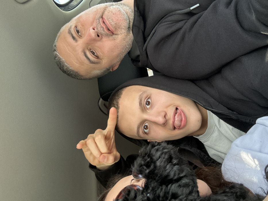 The image displays three individuals inside a vehicle in Zlatinitsa, Bulgaria. On the right, an adult male with short, grey hair and a beard wears a black hooded sweatshirt and looks towards the camera with a neutral expression. In the center, a young male with short, dark hair, wearing a black hooded sweatshirt over a light shirt, has his tongue extended in a playful gesture, looking directly at the camera. On the left, a female is partially visible; her face is obscured by dark sunglasses and a dark, textured, furry object. Her right hand is positioned above the young male's head, forming an 'L' shape with her index finger and thumb, pointing towards his forehead. The vehicle interior features a light grey ceiling and dark upholstery.