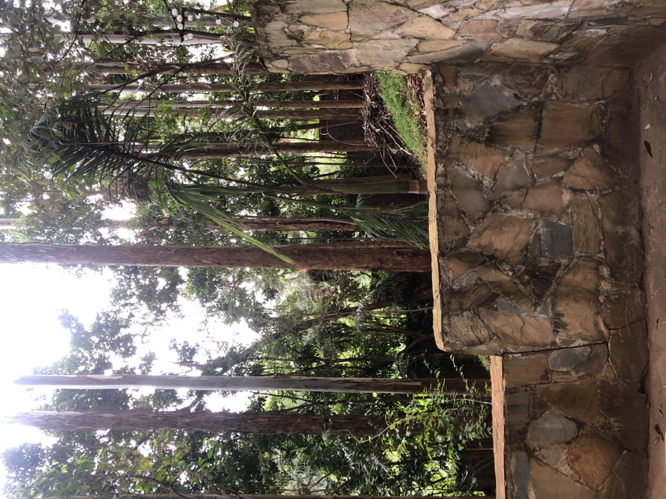 A stone wall frames a verdant forest. Tall, slender trees reach towards a bright sky, their leaves creating a dense canopy. A palm tree stands out amidst the other trees. Patches of greenery are visible along the ground. The stone wall is constructed with irregularly shaped stones in shades of brown and gray. The scene conveys a sense of tranquility and natural beauty.