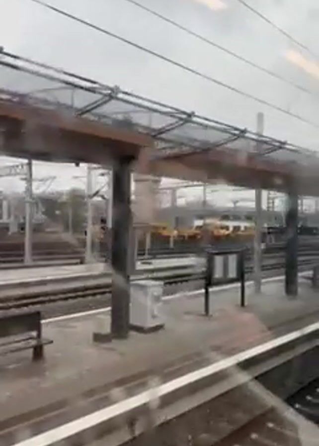 The view from inside a moving train shows a train station platform on a rainy day. The platform has a gray, concrete surface with benches. A roof structure covers part of the platform. Multiple railway tracks run parallel to the platform. Other trains, predominantly yellow and white, are visible on adjacent tracks. The overcast sky suggests a dull and gray day. The train from which the video is taken appears to be slowly moving along the tracks. The window is somewhat obscured by raindrops. The overall scene is of a typical, busy railway station under damp weather conditions.