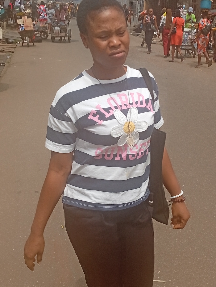 A woman in a striped shirt and black pants stands on a street. The shirt has pink writing that says "Florida Sunset" and a white crocheted flower detail. She wears a necklace and beaded bracelets. The street is busy with people and carts. There is some out of focus signage in the background. She appears to have a black bag over her shoulder.