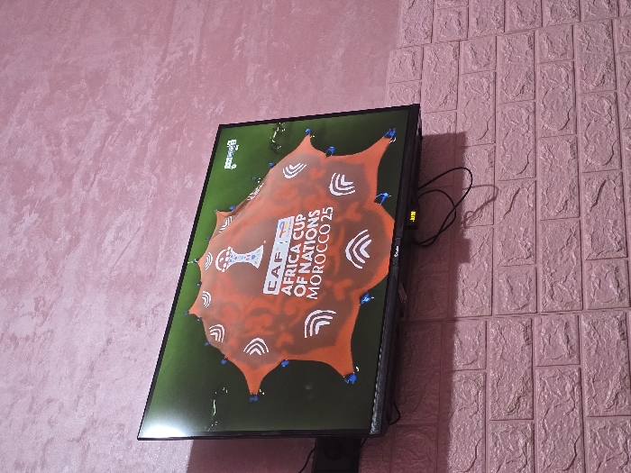 A flat-screen television hangs on a pink wall. The screen displays the CAF Africa Cup of Nations Morocco 25 logo in a vibrant red, set against a green background. The logo features a trophy graphic, bold text, and stylized tribal patterns. The wall behind the television has a textured, brick-like pattern, while the adjacent wall is a smooth, painted pink. A power cord dangles from the television.