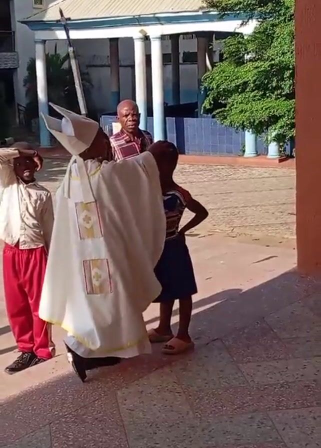 A young child dressed in a white and gold bishop's robe and a mitre stands holding a staff on a tiled surface near the corner of a building. Other children stand around, along with an older man in a plaid shirt. The building has a white and blue trim and is set against a background of green trees and blue sky.